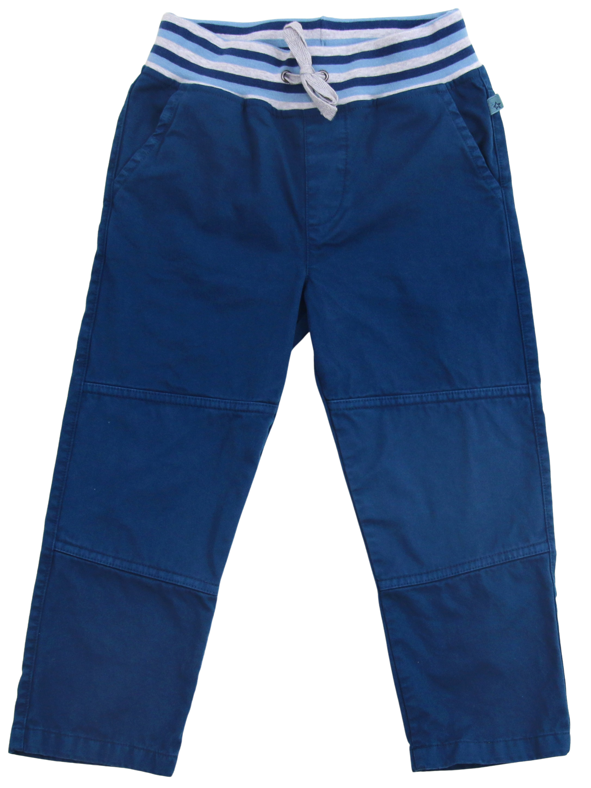 Dunkelblaue Webhose mit gestreiftem Rippbund und Kordel zum verstellen ,sodass die Hose perfekt sitzt. Der Kniebereich ist extra gedoppelt, deshalb macht die Hose sehr vieles mit.