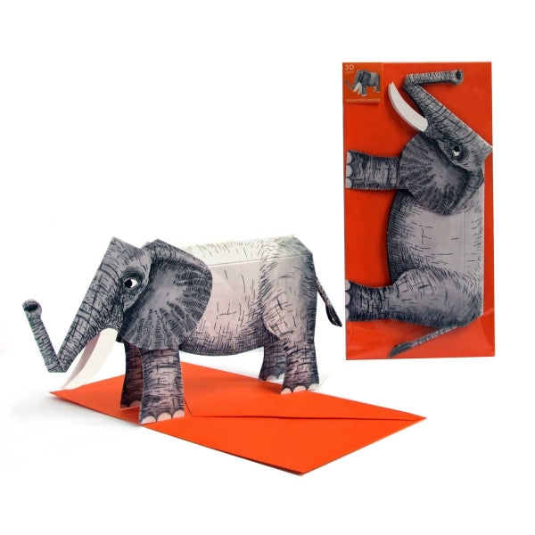Dreidimensionale Elefant die auf der Innenseite beschreibbar ist. Im Couvert wird sie zum Standardbrief und ausgepackt zur 3D-Grusskarte.