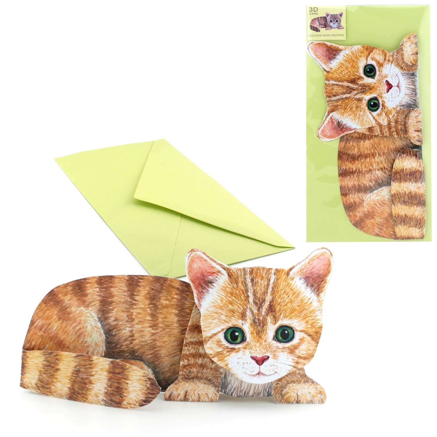 Dreidimensionale Katze die auf der Innenseite beschreibbar ist. Im Couvert wird sie zum Standardbrief und ausgepackt zur 3D-Grusskarte.