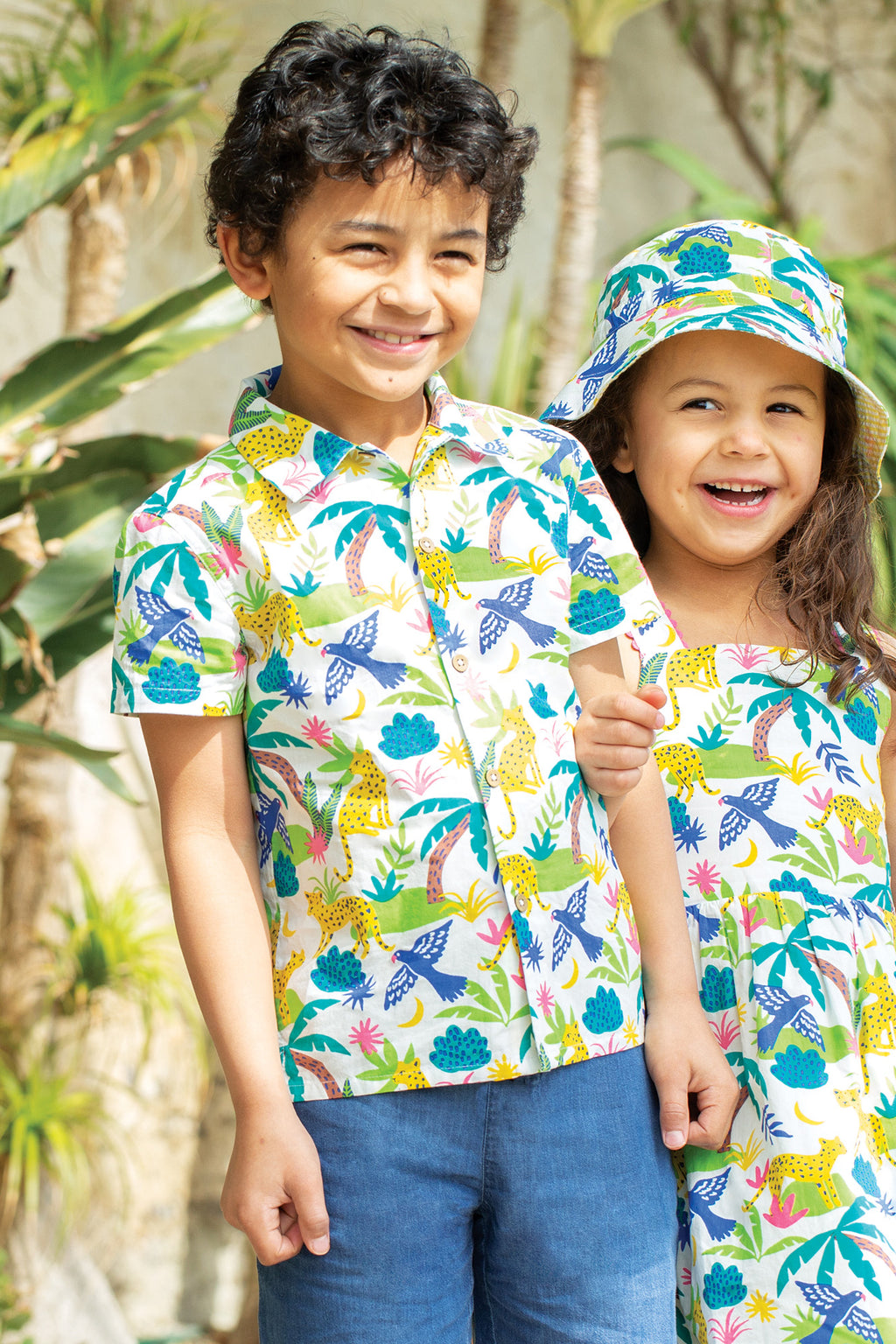 Hemd mit Jaguar, Papageien und Palmen bedruckt von der Marke Frugi.