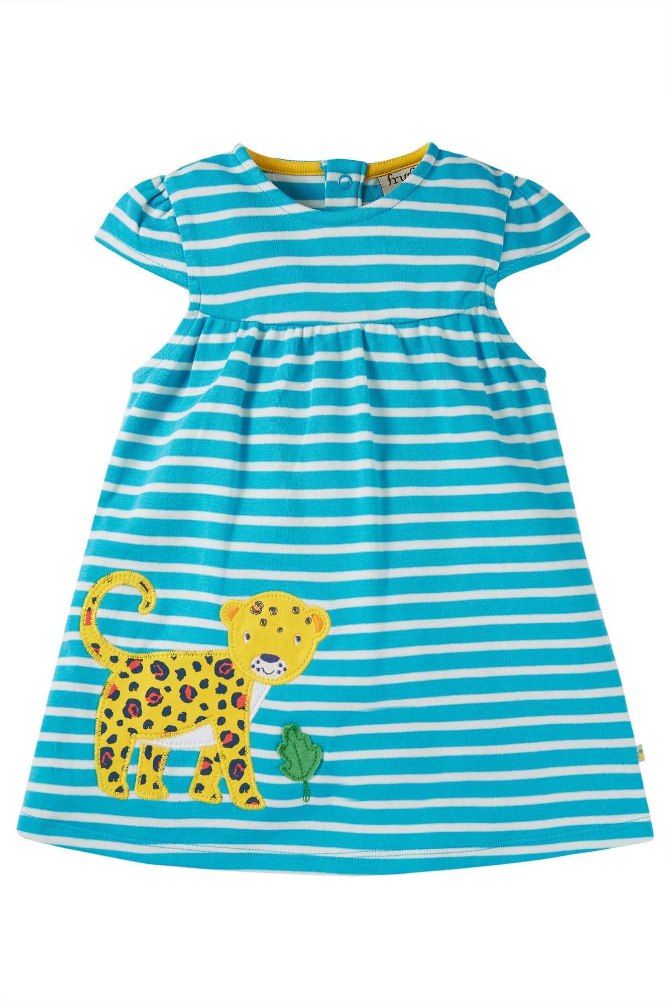 Kleid blau weiss gestreift mit einem Leoparden appliziert , von der Marke Frugi.