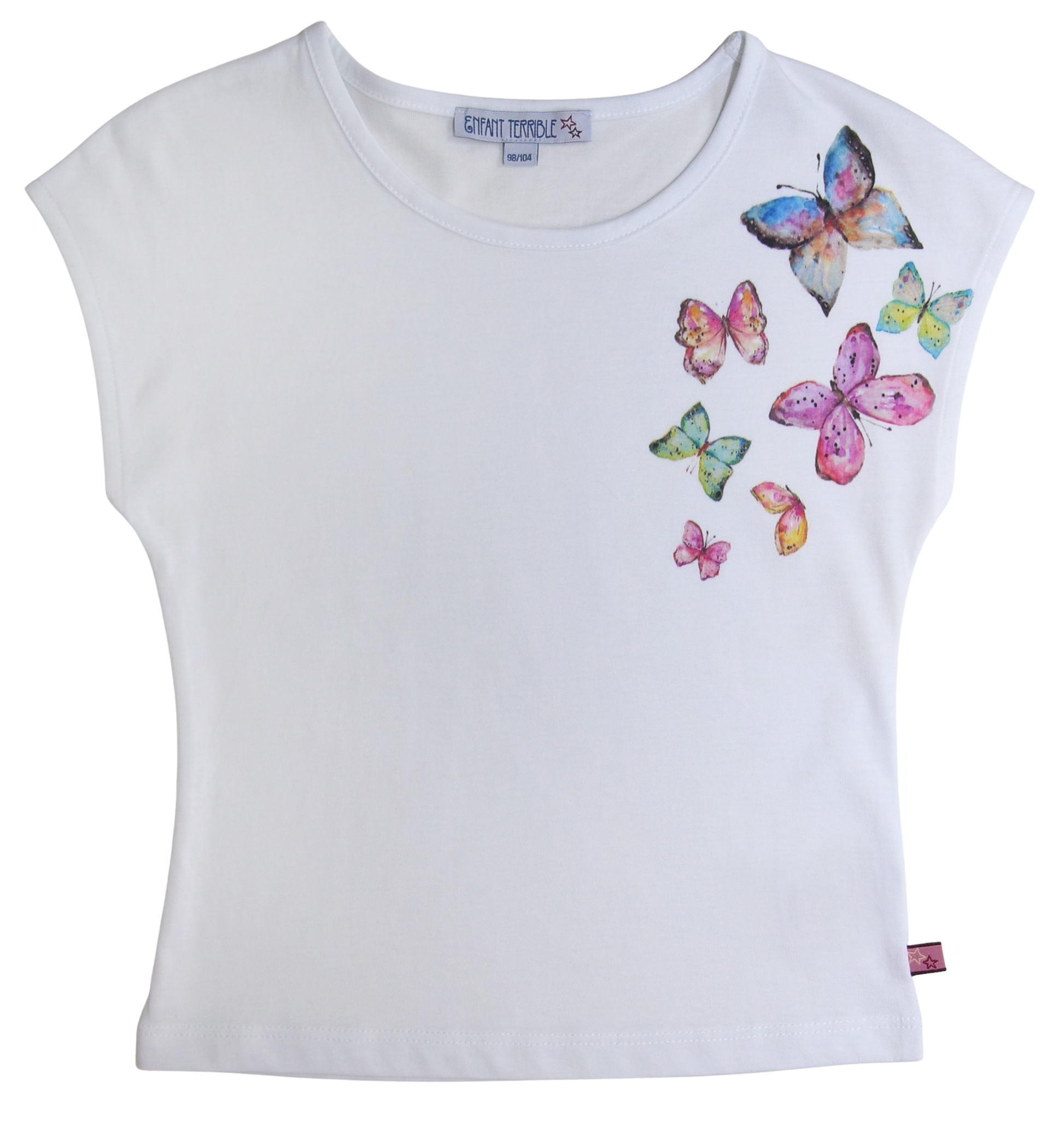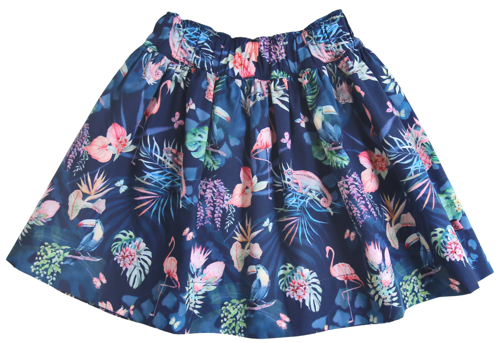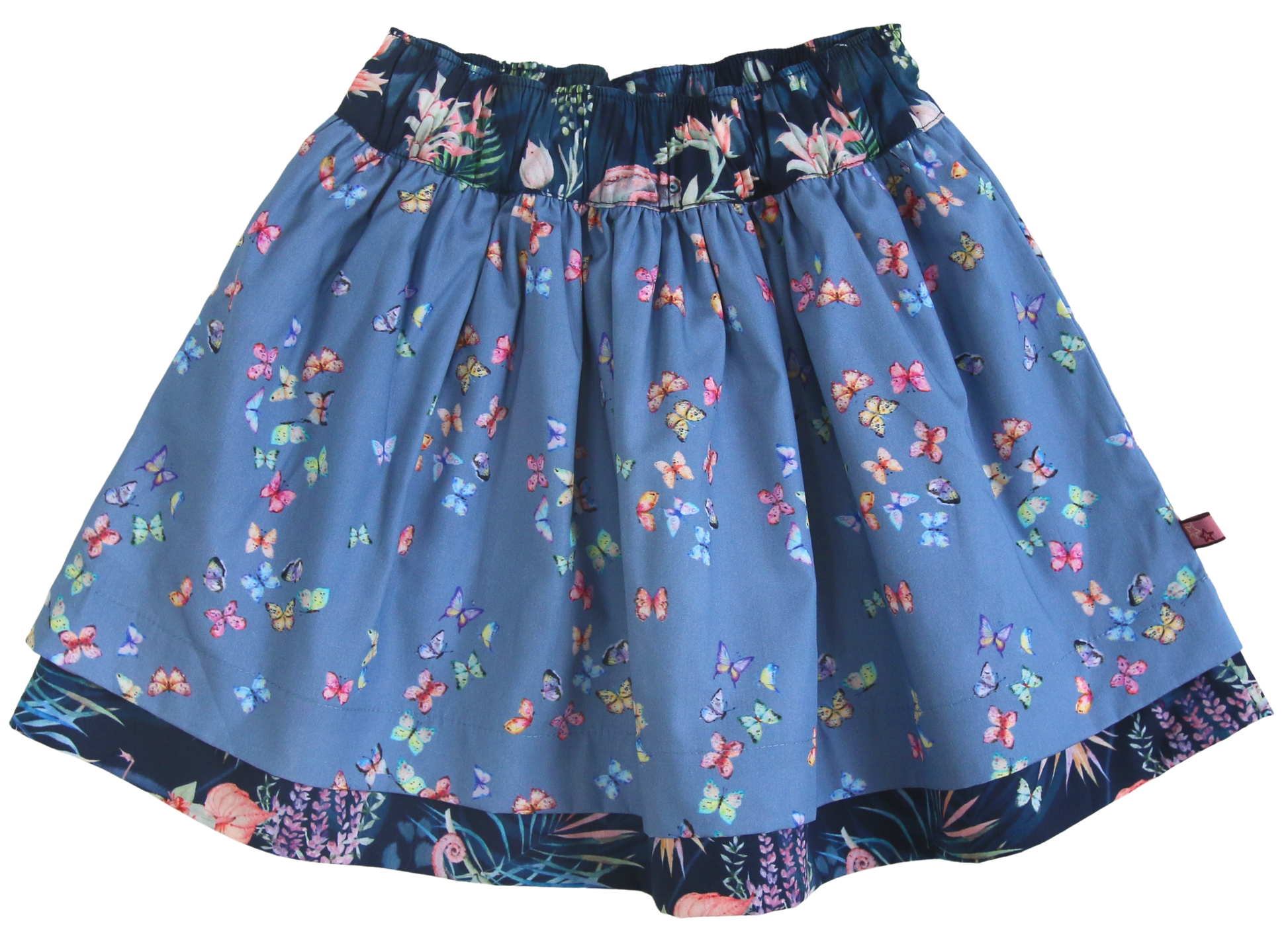 Der Zauberhafter Wenderock kann man nach Lust und Laune wenden. Auf einer Seite ist er in der Farbe blau mit Schmetterling Muster und auf der andere Seite mit in blau mit Dschungel Muster. In der Taille gibt es einen bequemen Gummizug. Die passende Shirts haben wir auch im Online Shop.