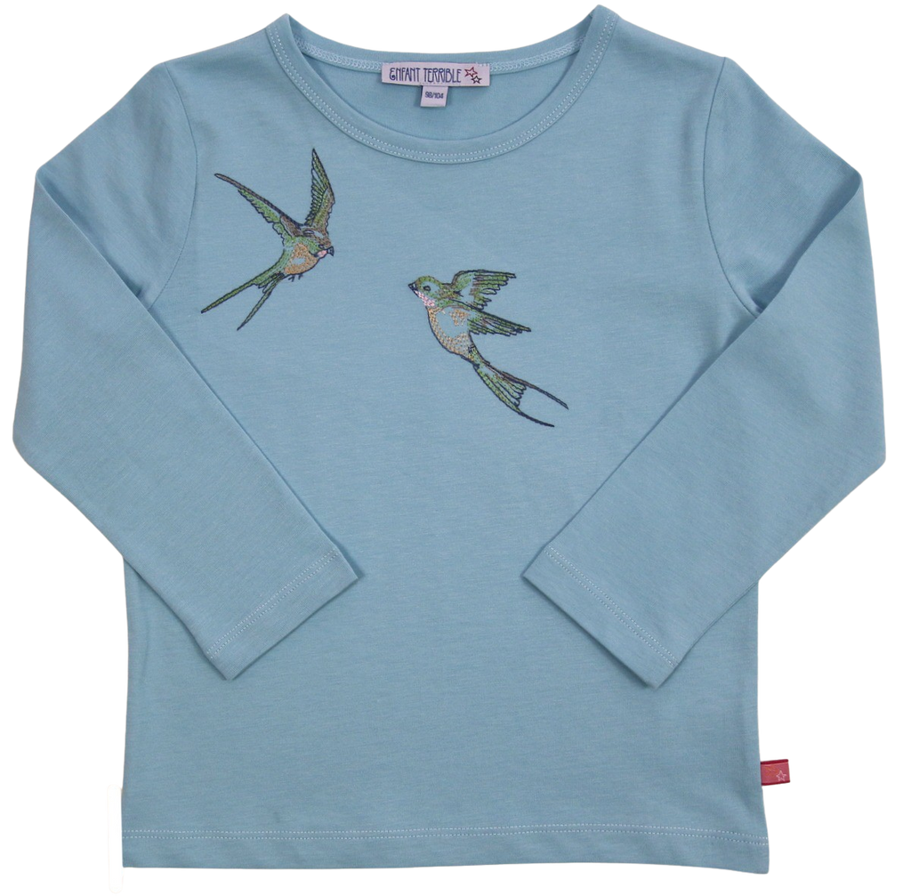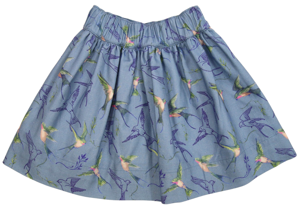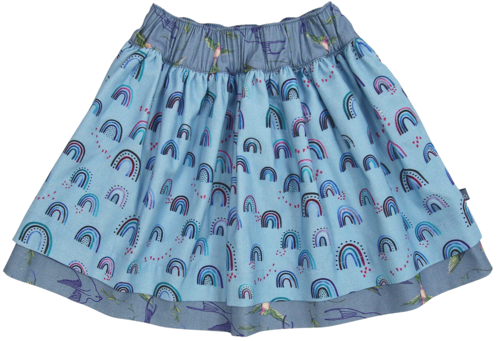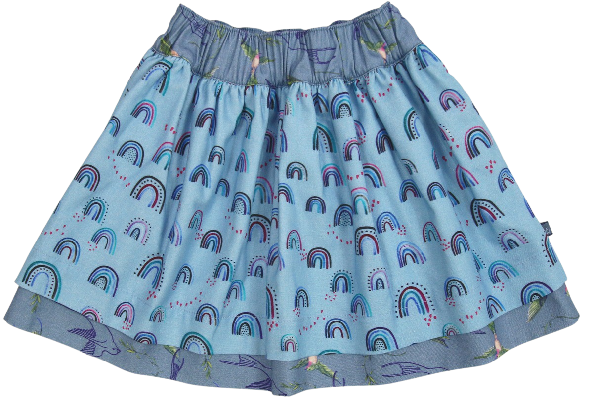 Der Zauberhafter Wenderock kann man nach Lust und Laune wenden. Auf einer Seite in blau mit Regenbogen bedruckt und auf der andere Seite mit Vögel verziert. In der Taille gibt es einen bequemen Gummizug. Die passende Shirts und Leggins haben wir auch im Online Shop.